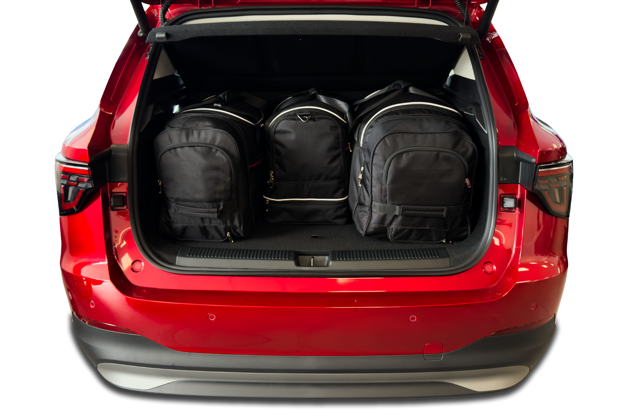 The bags fill every square inch of the boot thanks to their slanted sides that match the angle of the rear seats. This is a unique feature of KJUST car bags.