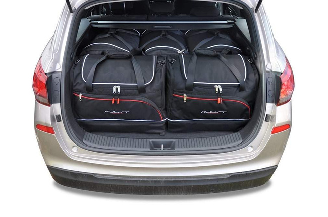 Les sacs remplissent chaque centimètre carré du coffre grâce à leurs côtés inclinés qui correspondent à l'inclinaison des sièges arrière. C'est une caractéristique unique des sacs KJUST.