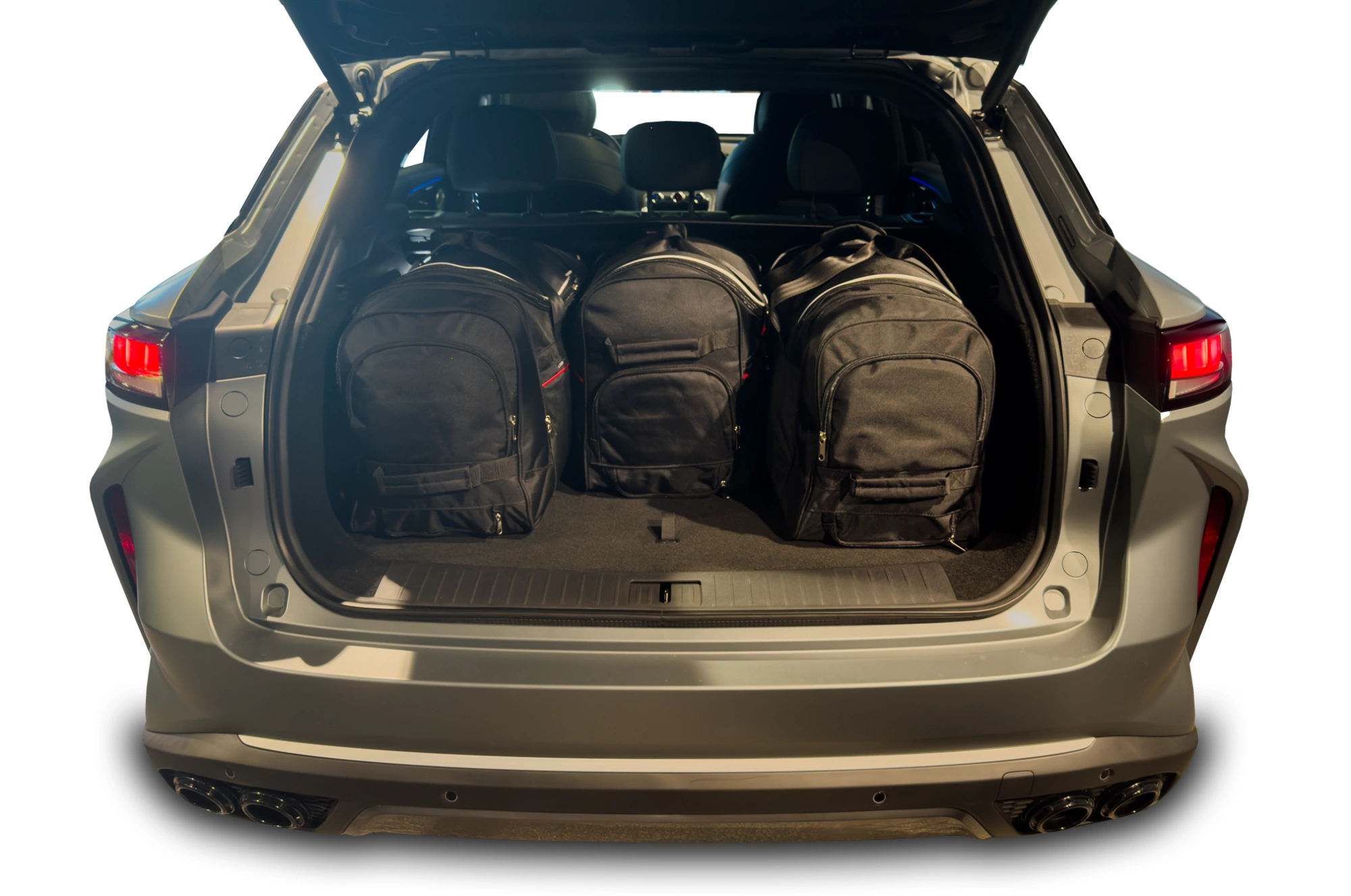 Les sacs remplissent chaque centimètre carré du coffre grâce à leurs côtés inclinés qui correspondent à l'inclinaison des sièges arrière. C'est une caractéristique unique des sacs KJUST.
