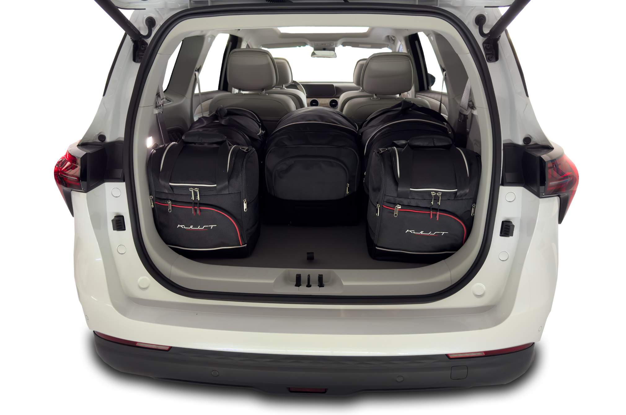 Les sacs remplissent chaque centimètre carré du coffre grâce à leurs côtés inclinés qui correspondent à l'inclinaison des sièges arrière. C'est une caractéristique unique des sacs KJUST.