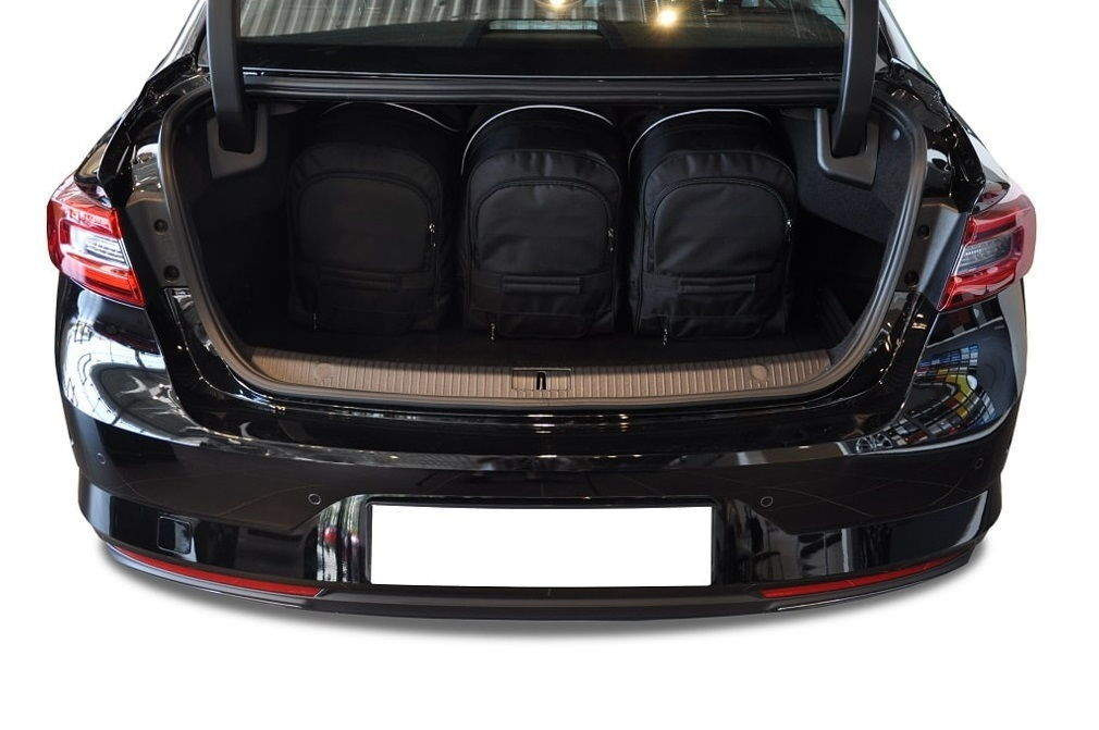 Dank ihrer schrägen Seiten, die an die Neigung der Rücksitze angepasst sind, füllen die Taschen den Kofferraum optimal aus. Dies ist eine einzigartige Eigenschaft der KJUST Taschen.