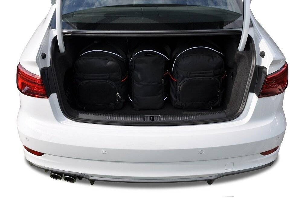 Dank ihrer schrägen Seiten, die an die Neigung der Rücksitze angepasst sind, füllen die Taschen den Kofferraum optimal aus. Dies ist eine einzigartige Eigenschaft der KJUST Taschen.