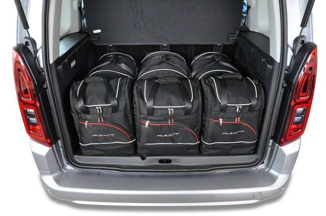Dank ihrer schrägen Seiten, die an die Neigung der Rücksitze angepasst sind, füllen die Taschen den Kofferraum optimal aus. Dies ist eine einzigartige Eigenschaft der KJUST Taschen.