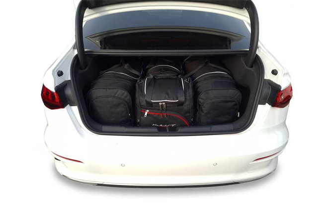 Le borse riempiono ogni centimetro quadrato del bagagliaio grazie ai lati inclinati che si allineano con l'angolazione dei sedili posteriori. Questa è una caratteristica unica delle borse KJUST.