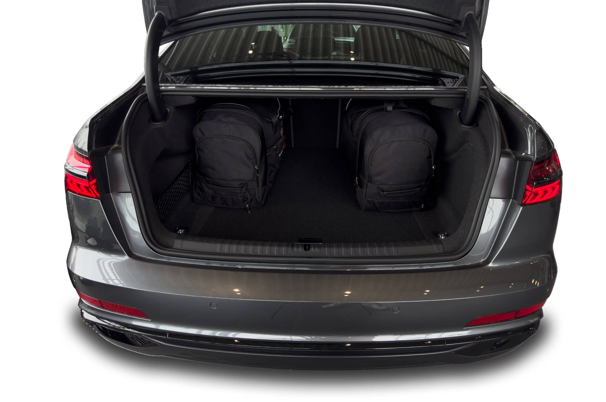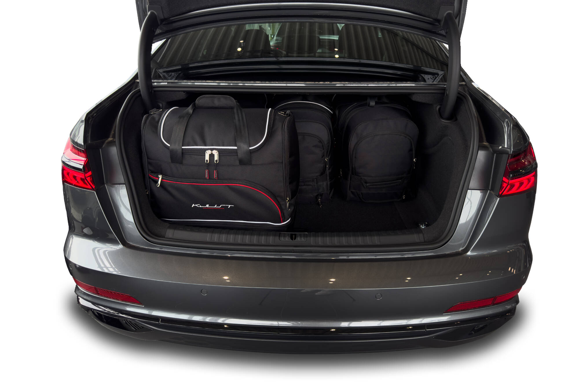 Le borse riempiono ogni centimetro quadrato del bagagliaio grazie ai lati inclinati che si allineano con l'angolazione dei sedili posteriori. Questa è una caratteristica unica delle borse KJUST.
