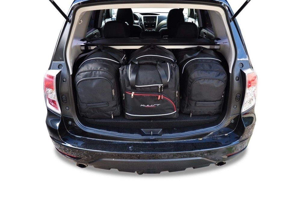 Las bolsas llenan cada centímetro cuadrado del maletero, gracias a sus laterales oblicuos adaptados a la inclinación de los asientos traseros. Es una característica única de las bolsas KJUST.