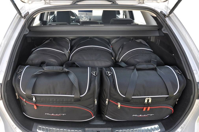 Las bolsas llenan cada centímetro cuadrado del maletero, gracias a sus laterales oblicuos adaptados a la inclinación de los asientos traseros. Es una característica única de las bolsas KJUST.