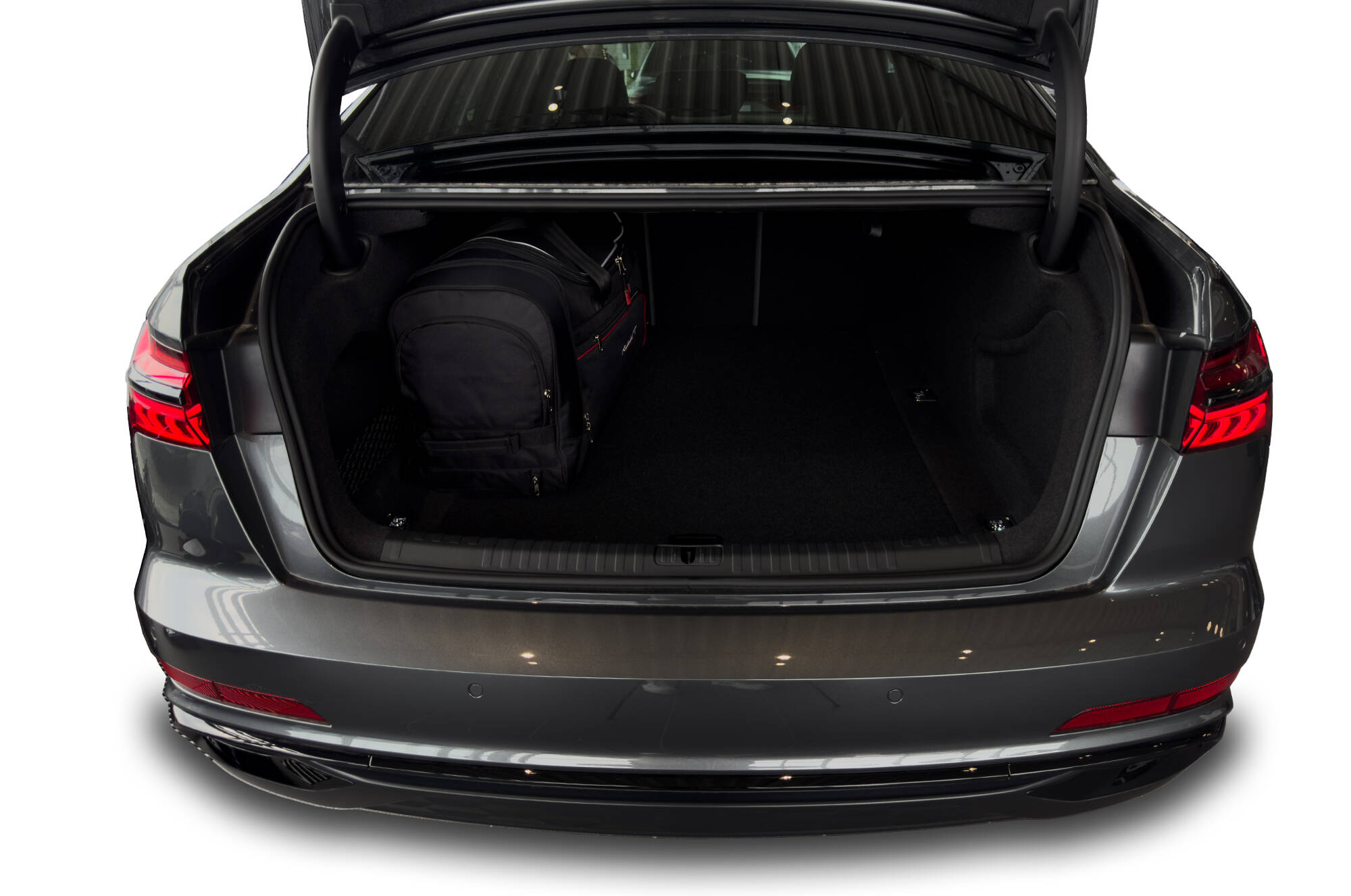 Las bolsas llenan cada centímetro cuadrado del maletero, gracias a sus laterales oblicuos adaptados a la inclinación de los asientos traseros. Es una característica única de las bolsas KJUST.