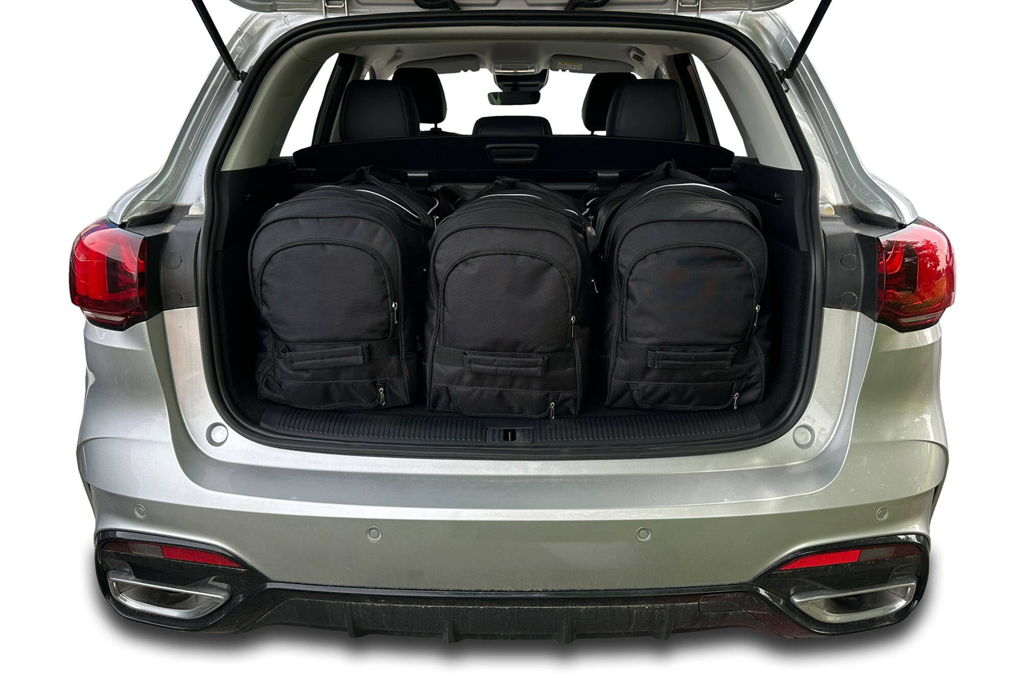 Las bolsas llenan cada centímetro cuadrado del maletero, gracias a sus laterales oblicuos adaptados a la inclinación de los asientos traseros. Es una característica única de las bolsas KJUST.